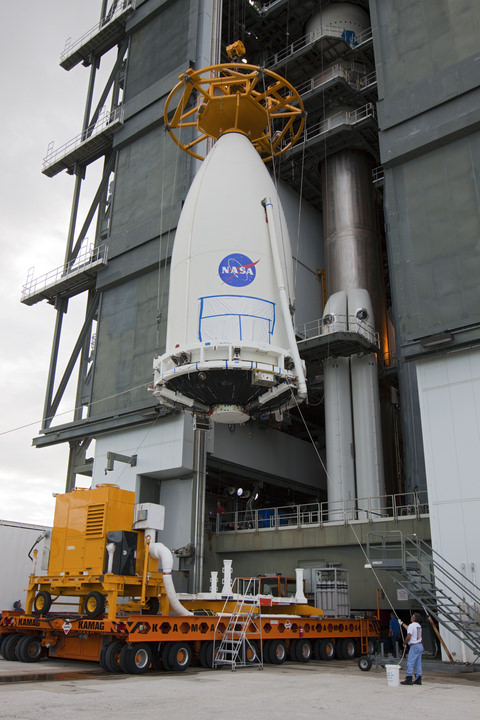 [caption id="attachment_90738" align="alignleft" width="386" caption="Curiosity, inside the payload fairing at Pad 41, has been attached to a lifting device in order to be raised and attached to the Atlas V rocket inside the Vertical Integration Facility. The fairing will protect the payload from heat and aerodynamic pressure generated during ascent. Credit: NASA/Kim Shiflett"]