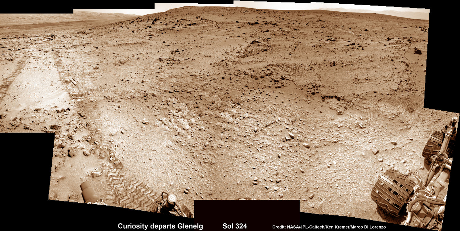 On July 4 (Sol 324), the six wheeled robot started driving away from the Glenelg and Yellowknife Bay areas where she has worked more than half a year investigating the alien terrain and drilling into Martian rocks for the first time in history.
