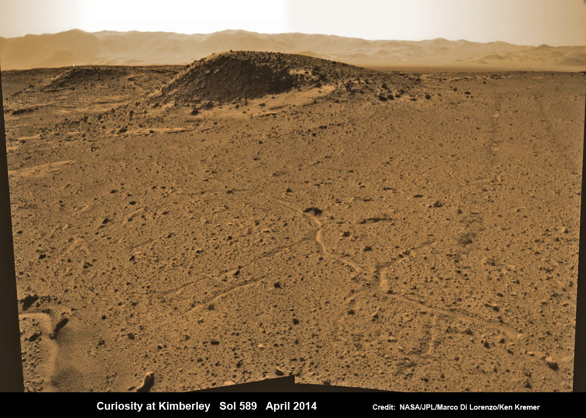 Curiosity maneuvers into 'Kimbeley' and scans scientifically intriguing Martian rock outcrops in search of next drilling location exhibiting several shallow hills in foreground and dramatic Gale crater rim backdrop. Rover tracks at right in this colorized Navcam photomosaic assembled from raw images snapped on Sol 589, April 3, 2014. Credit: NASA/JPL/Marco Di Lorenzo /Ken Kremer - kenkremer.com[/caption]