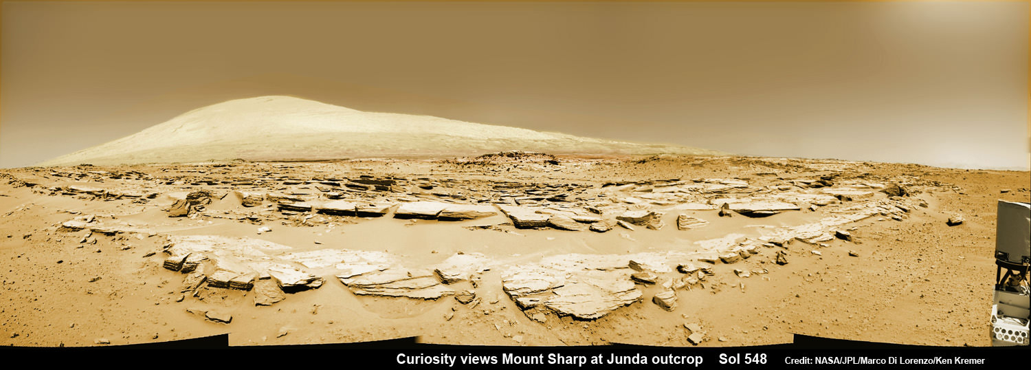 Mars rock rows and Spectacular Mount Sharp Martian landscape scene with rows of striated rocks in the foreground and spectacular Mount Sharp on the horizon. NASA's Curiosity Mars rover paused mid drive at the Junda outcrop to snap the component images for this colorized navcam camera photomosaic on Sol 548 (Feb. 19, 2014) and then continued traveling southwards towards mountain base. UHF Antenna at right. Credit: NASA/JPL-Caltech/Marco Di Lorenzo/Ken Kremer-kenkremer.com See stereo 3-D and look back views below[/caption]