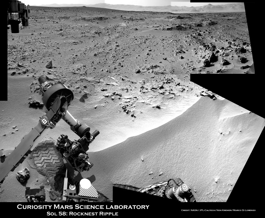 Image caption: Context view of Curiosity working at 'Rocknest' Ripple. Curiosity's maneuvers robotic arm for close- up examination of 'Rocknest' ripple site and inspects sandy material at "bootlike" wheel scuff mark with the APXS (Alpha Particle X-Ray Spectrometer) and MAHLI (Mars Hand Lens Imager) instruments positioned on the rotatable turret at the arm's terminus. Mosaic was stitched together from Sol 57 & 58 Navcam raw images and shows the arm extended to fine grained sand ripple in context with the surrounding terrain and eroded rim of Gale Crater rim on the horizon. Rocknest patch measures about 8 feet by 16 feet (2.5 meters by 5 meters).See NASA JPL test scooping video below. Credit: NASA/JPL-Caltech/Ken Kremer/Marco Di Lorenzo