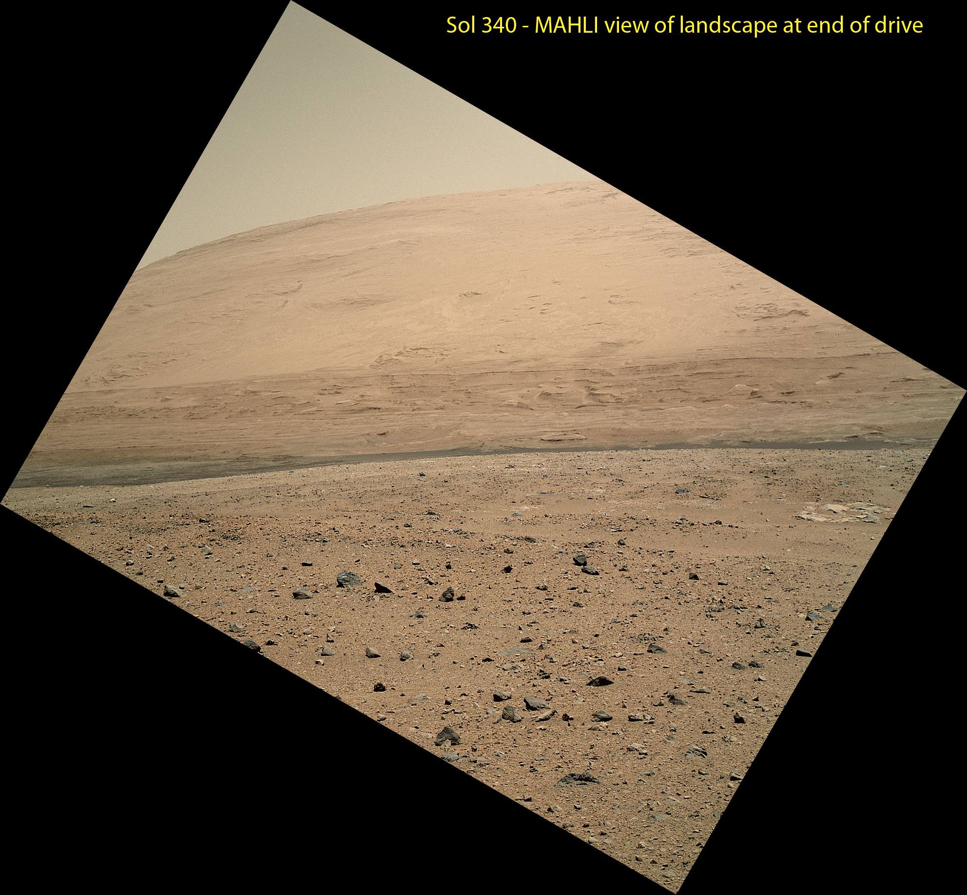 This scene was taken on Sol 340 shortly after Curiosity finished her longest drive yet The 329.1-foot (100.3-meter) drive was twice as long as any previous sol's drive by Curiosity. The view is toward the south, including a portion of Mount Sharp and a band of dark dunes in front of the mountain. The Mars Hand Lens Imager (MAHLI) camera on NASA's Curiosity rover is carried at an angle when the rover's arm is stowed for driving. Still, the camera is able to record views of the terrain Curiosity is crossing in Gale Crater, and rotating the image 150 degrees provides this right-side-up scene. Credit: NASA/JPL-Caltech/MSSS See updated Traverse Map below[/caption]