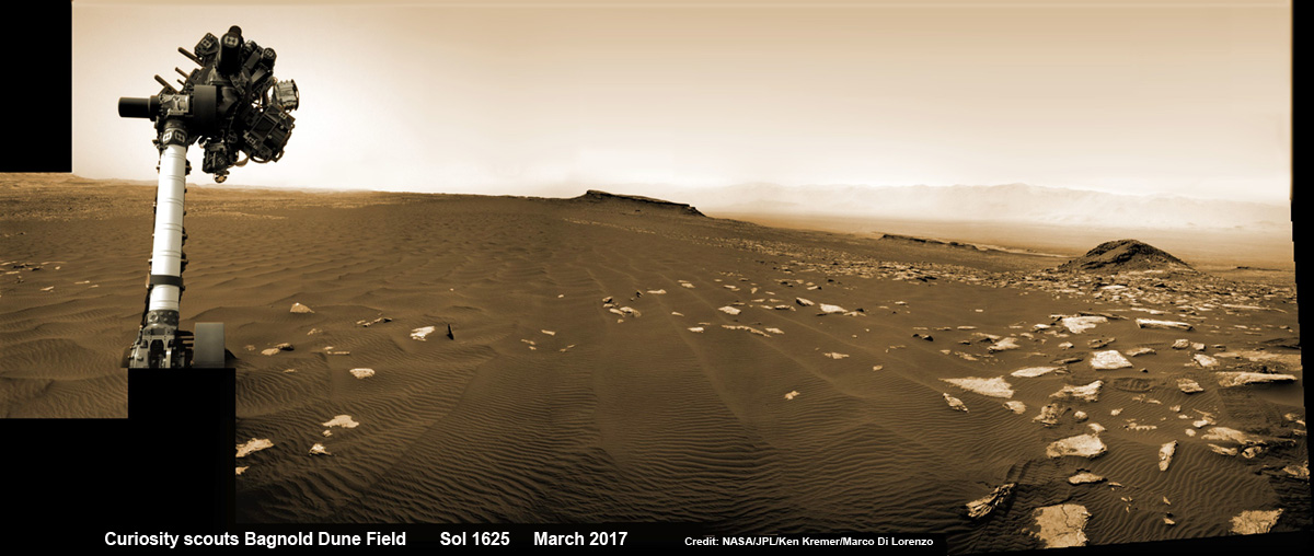 NASA's Curiosity rover explores sand dunes inside Gale Crater with Mount Sharp in view on Mars on Sol 1611, Feb. 16, 2017, in this navcam camera mosaic stitched from raw images and colorized. Credit: NASA/JPL/Ken Kremer/kenkremer.com/Marco Di Lorenzo[/caption]