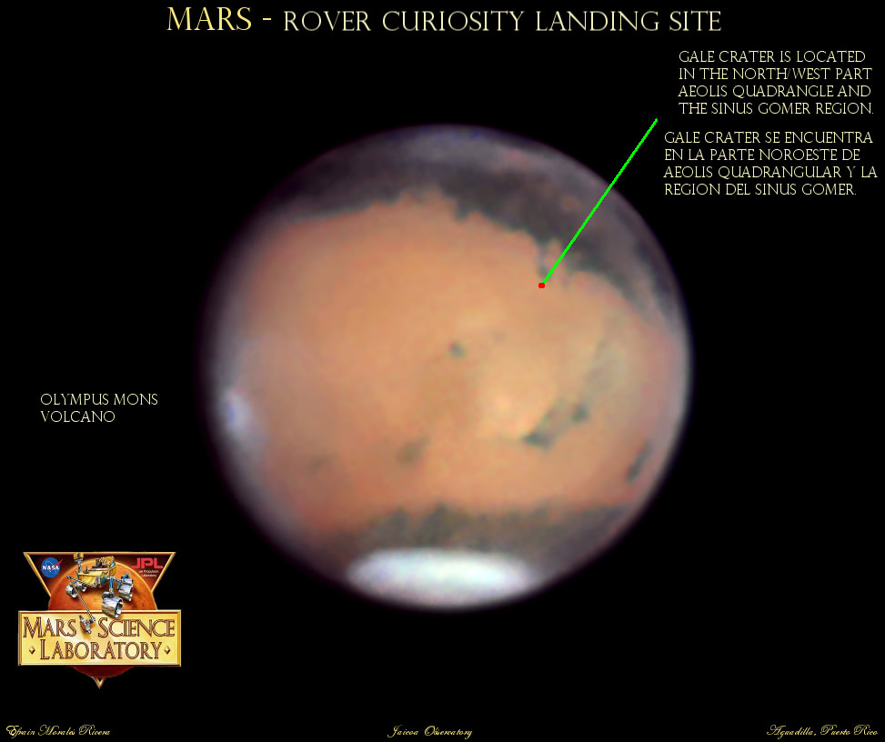 Where will the Mars Science Laboratory Curiosity rover land? This annotated image of Mars by Efrain Morales shows where on Mars Curiosity will set down, if all goes well, at about 05:31 UTC on Aug. 6 (10:31 p.m. PDT on Aug. 5, 1:31 a.m. EDT Aug. 6). (Use