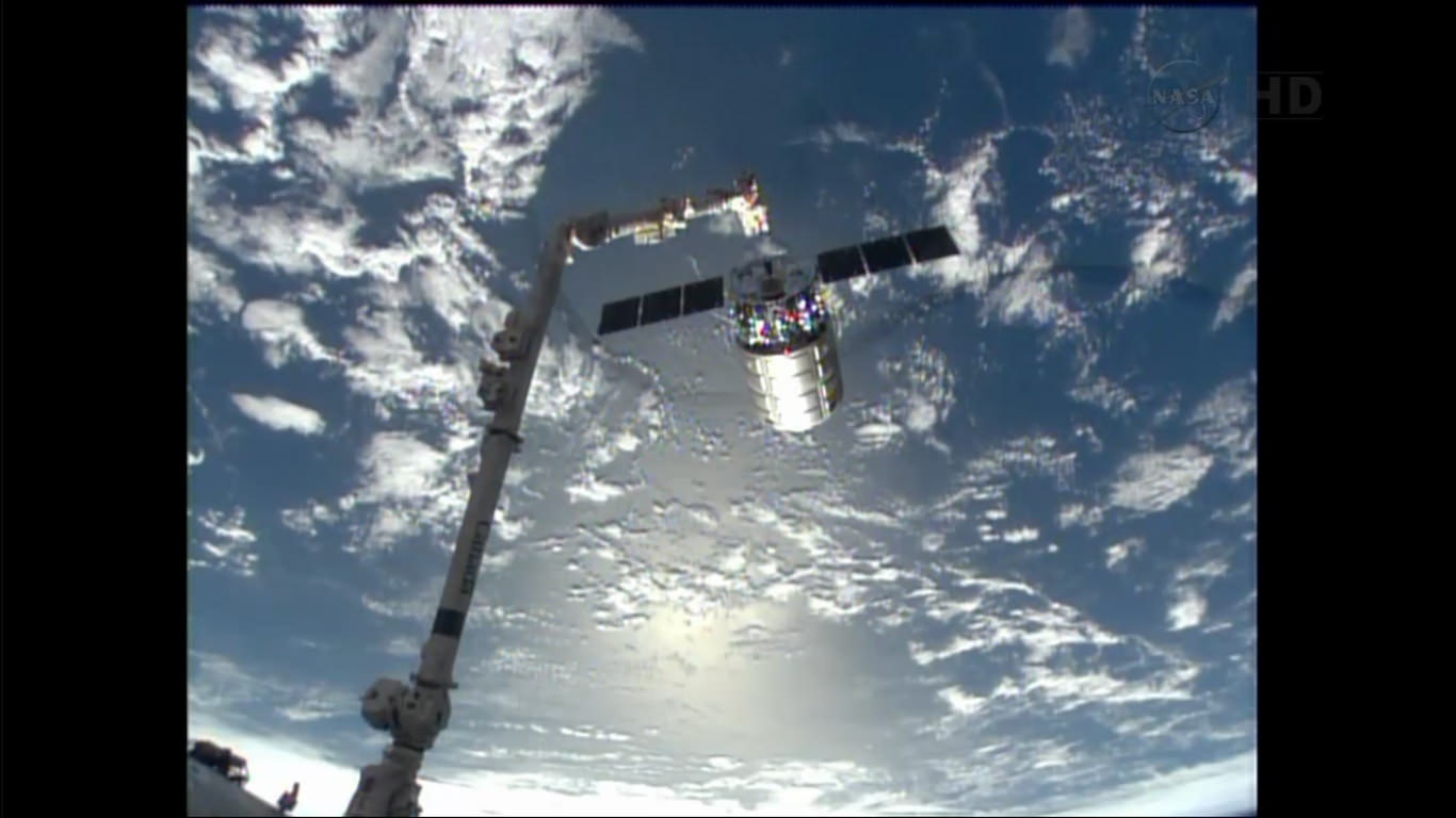 Space Station robotic arm releases Cygnus after detachment from the ISS Harmony node. Credit: NASA TV[/caption]