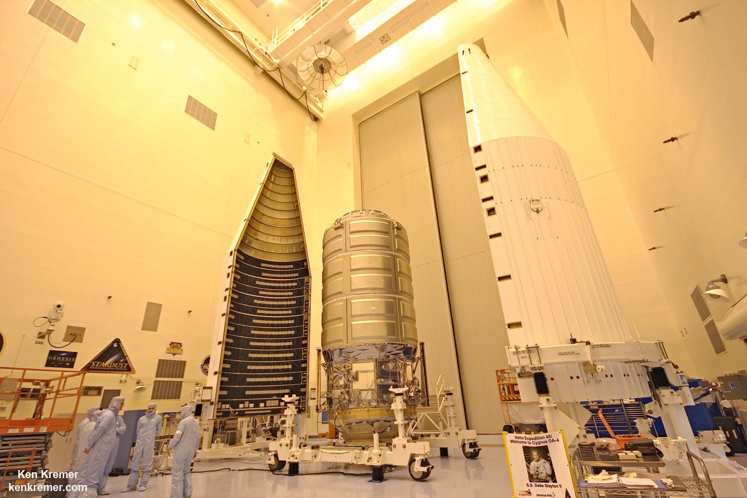 The encased Cygnus spacecraft will be transported to the Cape Canaveral launch pad later this week for mating atop the Atlas V rocket, which is now being assembled for flight.