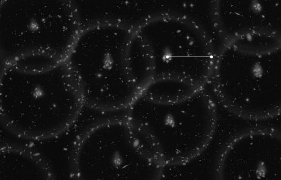 An illustration of baryon acoustic oscillations, which are imprinted in the early universe and can still be seen today in galaxy surveys like BOSS. Credit: Chris Blake and Sam Moorfield