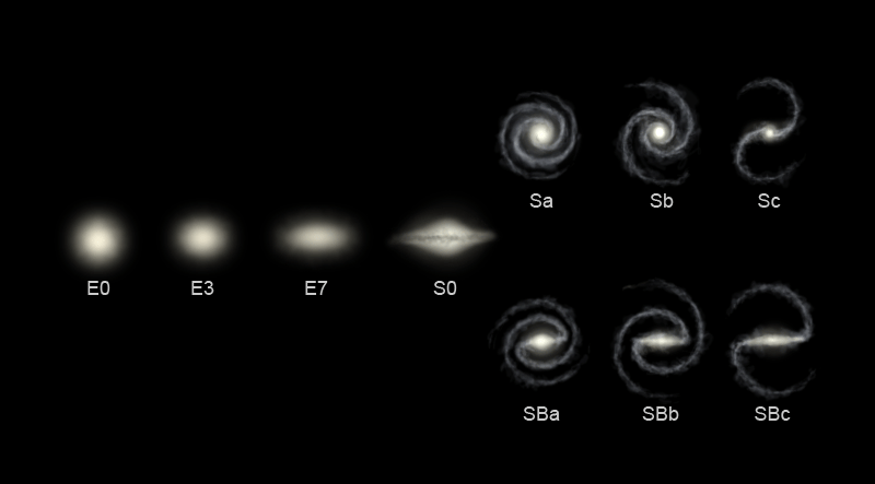 Lead image complete caption: A figure illustrating the Hubble sequence. On the left are elliptical galaxies, with their shapes ranging from spherical (E0) to elongated (E7). Type S0 is intermediate between elliptical and spiral galaxies. The upper right line of objects stretch from Sa (tightly wound spiral) to Sc (loosely wound spiral). The lower right line shows the barred spirals that range from the tightly wound SBa to loosely wound SBc types. Image: Ville Koistinen