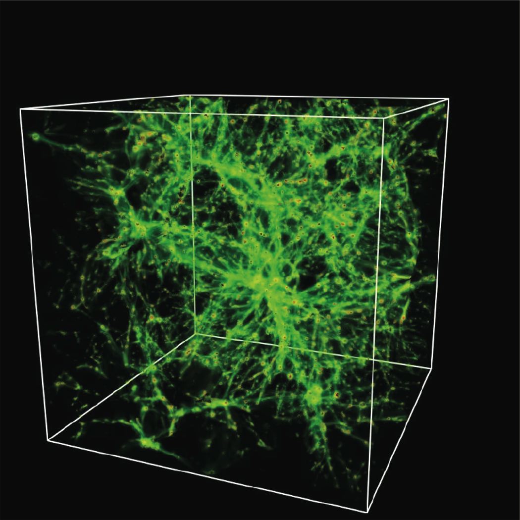 And also recently, very large scale structure simulations of our own Universe have addressed this by kind of starting out with an almost uniform distribution of dark matter in the very early Universe. And what they see is when they let the Universe evolve in time, for example, when the Universe is expanding, you kind of have these dark matter clumps forming into galaxies in all these filaments that you discussed.
