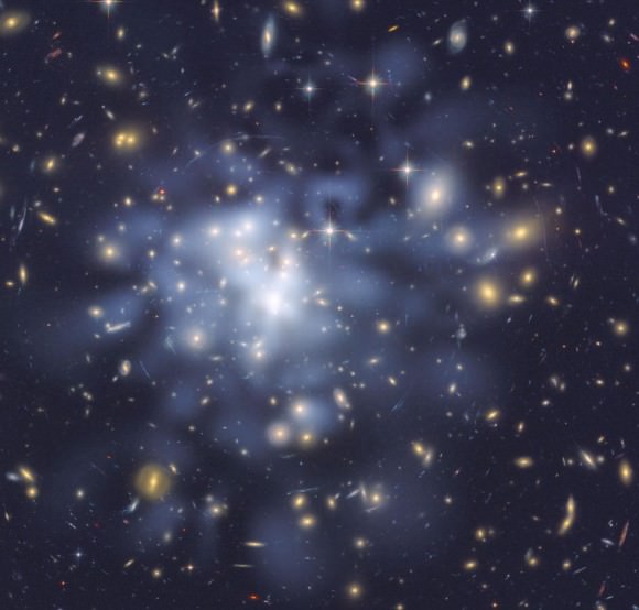 This NASA Hubble Space Telescope image shows the distribution of dark matter in the center of the giant galaxy cluster Abell 1689[/caption]