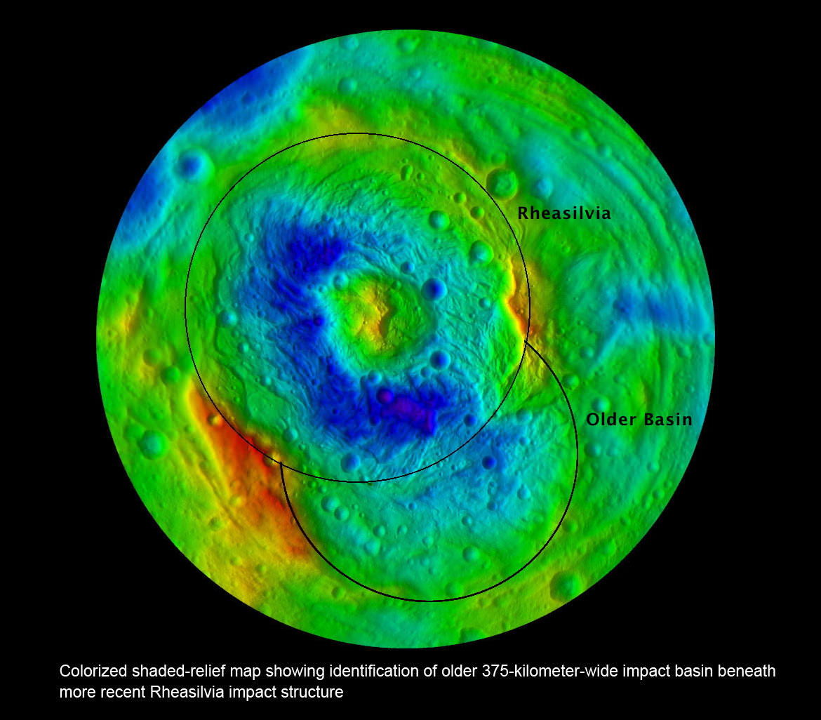 [caption id="attachment_89972" align="aligncenter" width="580" caption="Shaded-relief topographic map of Vesta southern hemisphere showing two large impact basins - Rheasilvia and Older Basin. Credit: NASA/JPL-Caltech/UCLA/MPS/DLR/IDA"]