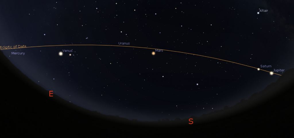 The Summer planetary lineup- The planets have, for the most part, been hiding out in the dawn sky through the first half of the year. July 2020 is a key time of transition for Jupiter and Saturn from the dawn to the dusk sky. Already, Jupiter can be seen creeping up over the eastern horizon after dusk, rising shortly after the Sun sets. We say an outer world is at opposition when it rises in the east, as the Sun sets to the west. This is also the point near which a given planet is closest to the Earth.