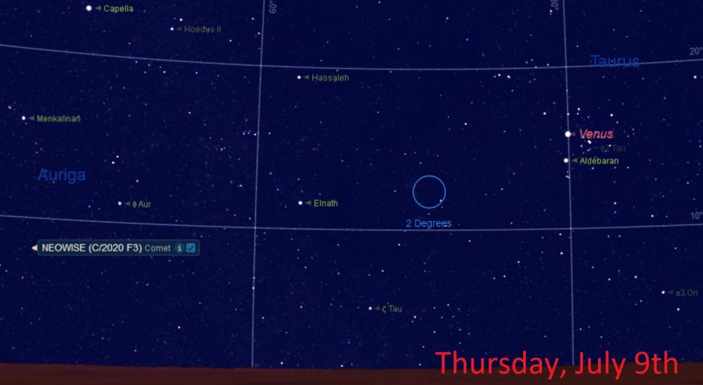 In fact, all of the classical naked eye planets inhabit the dawn sky in the first half of July. Near dawn, Saturn and Jupiter lay to the west, while Mars rides high to the south, and Venus dominates the eastern sky, fresh off of inferior conjunction last month. Look low to the east and you might even spy fleeting Mercury headed for greatest elongation 20 degrees west of the Sun on July 22nd, along with an extra special treat: the icy interloper comet C/2020 F3 NEOWISE, fresh off of perihelion on July 3rd and holding steady at magnitude +1.5.