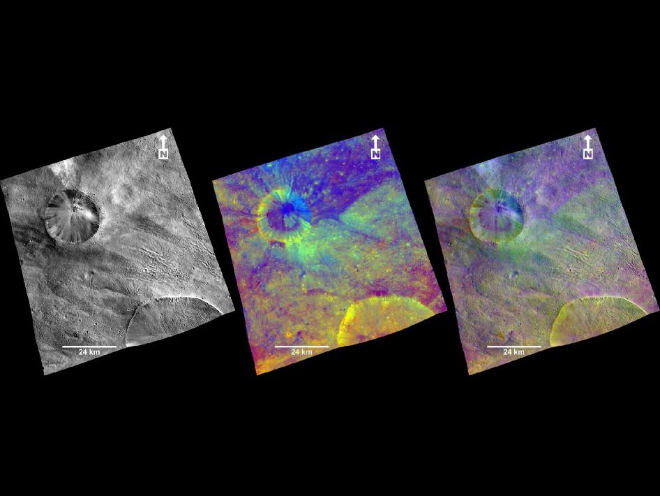 [caption id="attachment_94824" align="aligncenter" width="580" caption="These images of Tarpeia crater, near the south pole of the giant asteroid Vesta, were obtained by the visible and infrared mapping spectrometer on NASA's Dawn spacecraft. Image credit: NASA/JPL-Caltech/UCLA/INAF "]