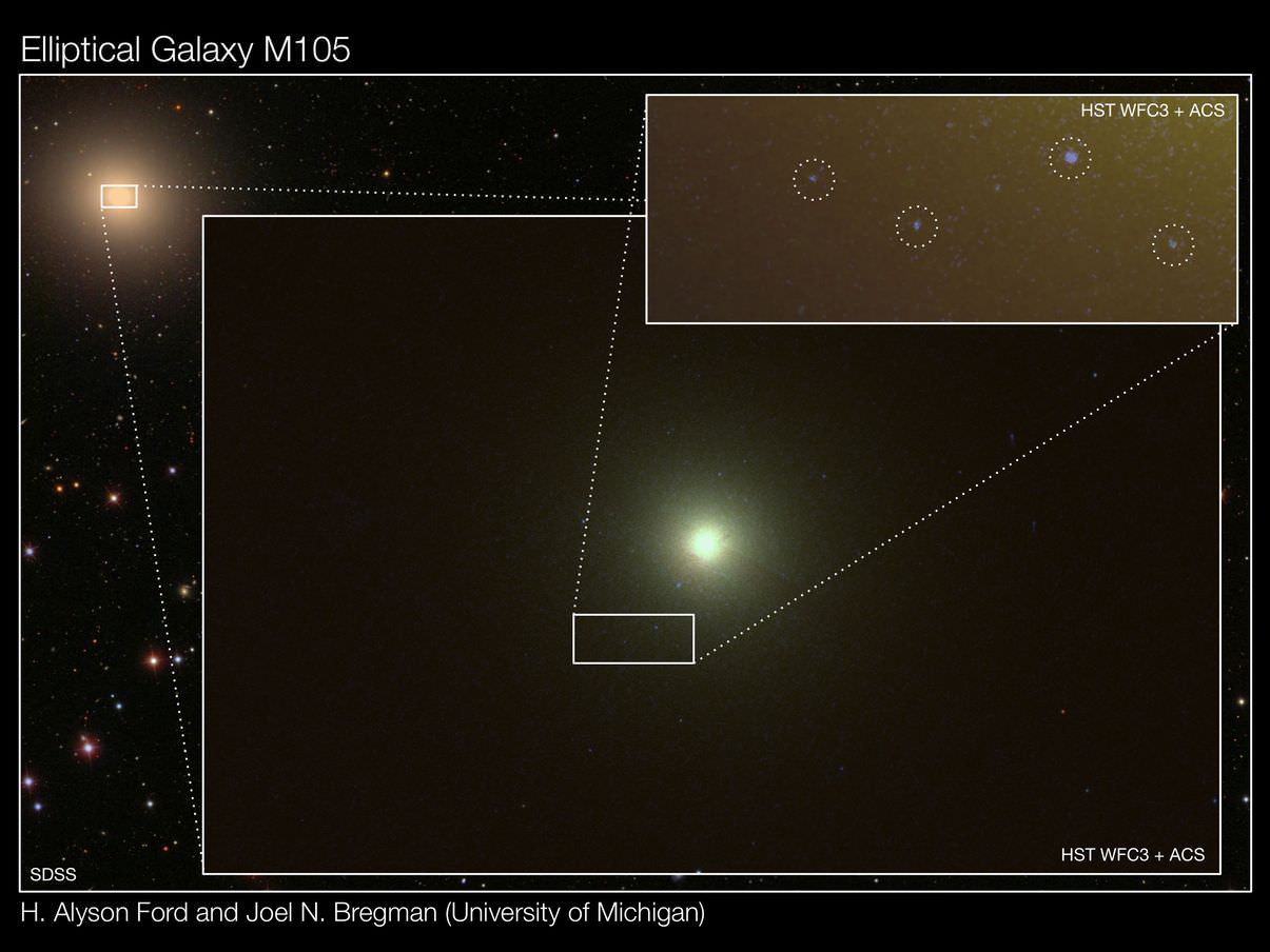 There was a time when most astronomers concluded that elliptical galaxies were a lot like their globular clusters - full of similarly evolved and aged stars. But not anymore. Thanks to the resolving power of the Hubble Space Telescope, a team of researchers from the University of Michigan were able to peer into the heart of Messier 105 and pick out several young stars and clusters. Apparently, "The reports of my death have been greatly exaggerated..."