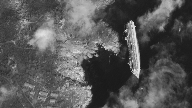 [caption id="attachment_92757" align="aligncenter" width="580" caption="Satellite Close-up of Wreckage of Costa Concordia Luxury Cruise Ship of the coast of Giglio, Italy. Credit: DIGITALGLOBE "]