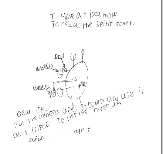 [/caption] We're all concerned about the Spirit rover, currently stuck in some soft soil on Mars. But some people are actually working hard to figure out how to rescue the rover. That includes a 7-year old boy named Julian who sent this drawing in to JPL with his idea of how help Spirit: use the robotic arm as a "tripod" to lift the rover up and help move it out of the spot where it is embedded. Julian, you have a bright future ahead of you as an engineer! "We are getting a lot of interesting suggestions from the public," said JPL's John Callas, MER project manager, "and we think that's wonderful. It shows people are interested in these rovers. We certainly are canvassing the full range of possibilities to get Spirit unstuck."