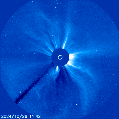 But as perihelion day approached yesterday on October 28th, things started to look grim. S1 ATLAS began to resemble a garden variety Kreutz sungrazer more and more. Little more than an icy rumble pile on final approach, the comet went in the inner field of view of the Solar Heliospheric Observatory's (SOHO) LASCO C2 imager and behind the central occulting disk yesterday morning… and failed to exit.