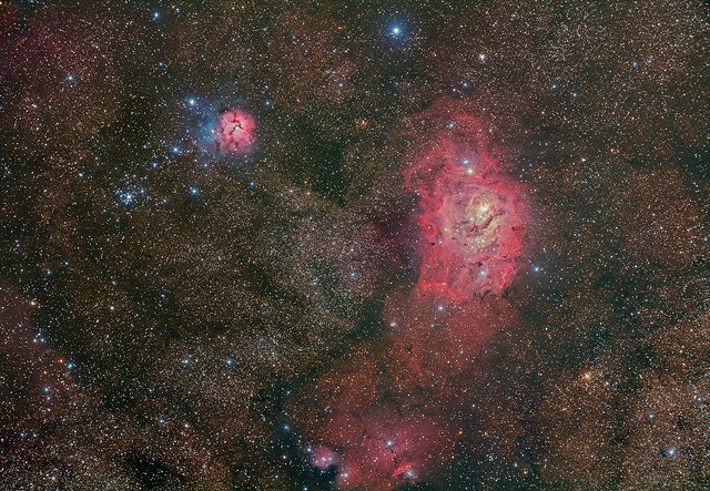 Here's a beautiful deep look at a wide-field view of the Lagoon Nebula (M8, NGC 6523) and the Trifid Nebula (M20, NGC 6514) along with star cluster M21 and star forming region NGC6559. Amateur astronomer and astrophotographer Terry Hancock from Michigan says this is one of his favorite fields of view to observe. However, right now it's very low in the southern sky and therefore limited to a couple of hours each night. Just wait until next month, and this region will be higher in the sky for better northern hemisphere viewing.