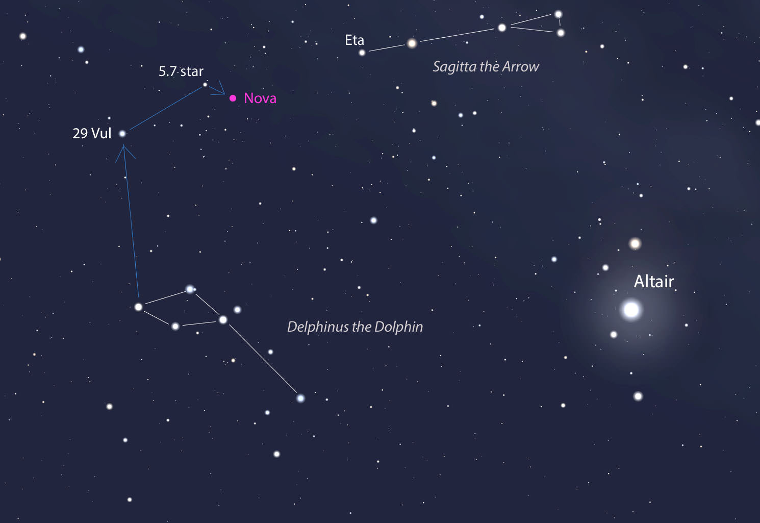 Delphinus is bordered by the constellations of Vulpecula, Sagitta, Aquila, Aquarius, Equuleus and Pegasus. It is visible to all viewers at latitudes between +90° and -70° and is best seen at culmination during the month of September. Are you ready to start exploring Delphinus with binoculars? Then we'll star with Alpha Delphini, whose name is Sualocin.