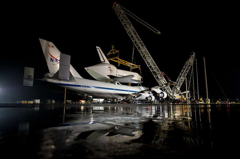 [caption id="attachment_94697" align="aligncenter" width="580" caption="Discovery awaits Demating after landing at Dulles Airport on April 17, 2012 and as numerous aircraft fly by for landing descent. Discovery sits atop modified Boeing 747 carrier jet. Hoisting cranes at left.