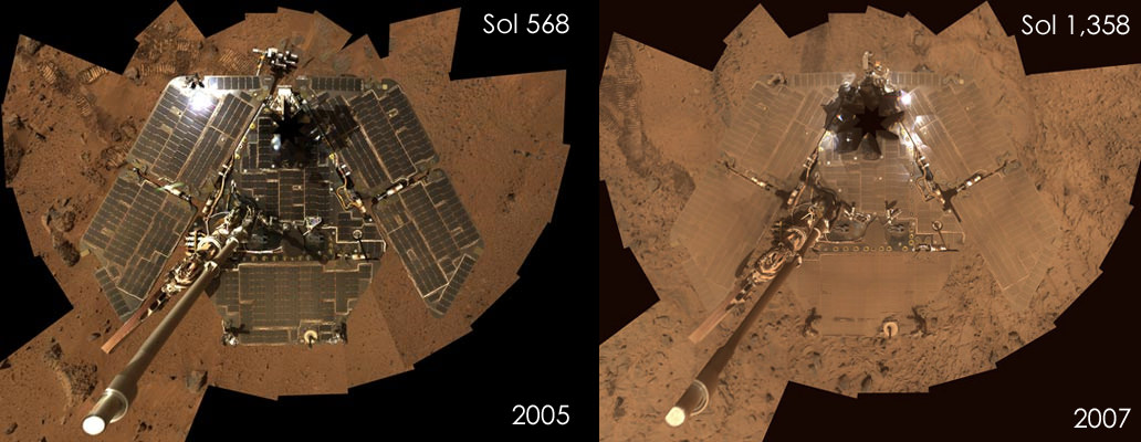 , nearly draining its batteries (as can be seen in the comparison above, after two years on the Martian surface, Spirit's dusty layer was already an acute problem).