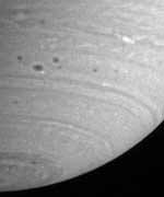 Image credit: NASA/JPL/Space Science Institute Several dark spots, or storms, are huddled in the mid-latitude region of Saturn's southern hemisphere. The largest of these storms is about 3000 kilometers (1860 miles) across, or about as wide as Japan is long. Also visible are light-colored, lacy cloud patterns indicative of atmospheric turbulence. The image was taken with the narrow angle camera through a near-infrared filter on May 7, 2004 from a distance of 28.2 million kilometers (17.5 million miles) from Saturn. Image scale is 168 kilometers (104 miles) per pixel. The image has been contrast-enhanced to aid visibility.