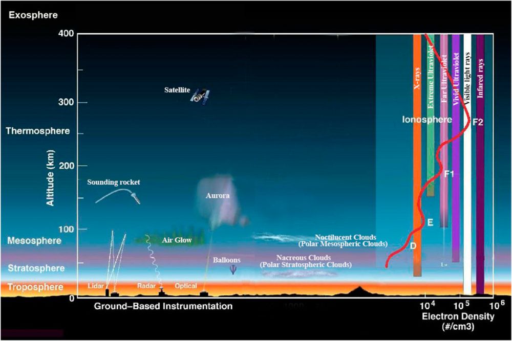 *The ionosphere is an abundant layer of electrons and ionized atoms and molecules that stretches from about 48 kilometers (30 miles) above the surface to the edge of space at about 965 km (600 mi), overlapping into the mesosphere and thermosphere. This dynamic region grows and shrinks based on solar conditions and divides further into the sub-regions: D, E and F; based on what wavelength of solar radiation is absorbed. Image Credit: By NASA Goddard - https://www.nccs.nasa.gov/news-events/nccs-highlights/global-ozone-profile, Public Domain, https://commons.wikimedia.org/w/index.php?curid=147614046*