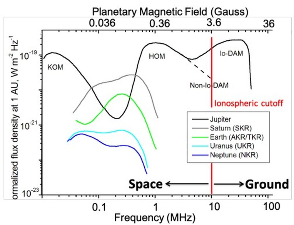 This figure shows the planetary magnetic fields of some Solar System planets and also shows the frequency cutoff for radio observations from space versus from the ground. Image Credit: Turner et al. 2025.