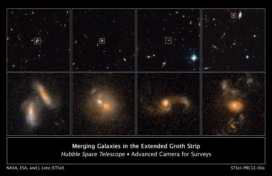 The science team, led by Jennifer Lotz of the Space Telescope Science Institute in Baltimore, Maryland, took a close look at galaxy interactions spaced over vast distances. This allowed the group to essentially study mergers which occurred at different times. What they found was larger galaxies had a merger rate of once every nine billion years, while smaller ones crashed up more often. When taking a look a dwarf galaxies compared to massive ones, the team found it happened three times more often than the rate for large galaxies.