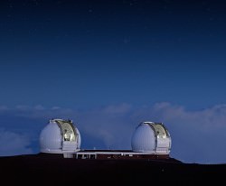 The two Keck 10-meter domes atop Mauna Kea. (Rick Peterson/WMKO)[/caption]