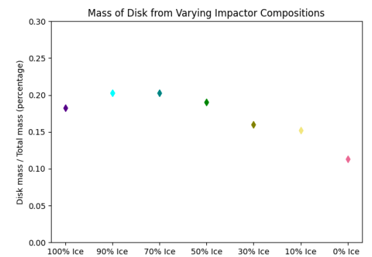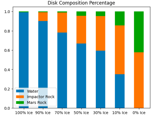 Varying the ice content in the impactor also affected the makeup of the disk. Different amounts of ice lead to disks with different amounts of Martian rock and impactor rock in the disk.