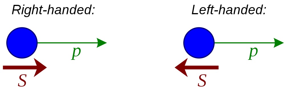 Every elementary particle has a rotation-like property known as spin. When a particle is shooting through space, the spin and motion can point along its direction of motion, or opposite to its motion. The former is known as right-handed chirality, while the latter is left-handed. Both matter and antimatter particles can have either chirality, except for the neutrino. Neutrinos are always left-handed, and anti-neutrinos are always right-handed.