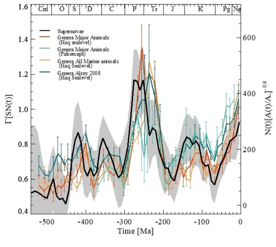 All of this appears to correlate with changes in supernova rates. If this link turns out to be solid, then supernovae may well influence climate and the energy available to biological systems. And all that has an influence on marine life.