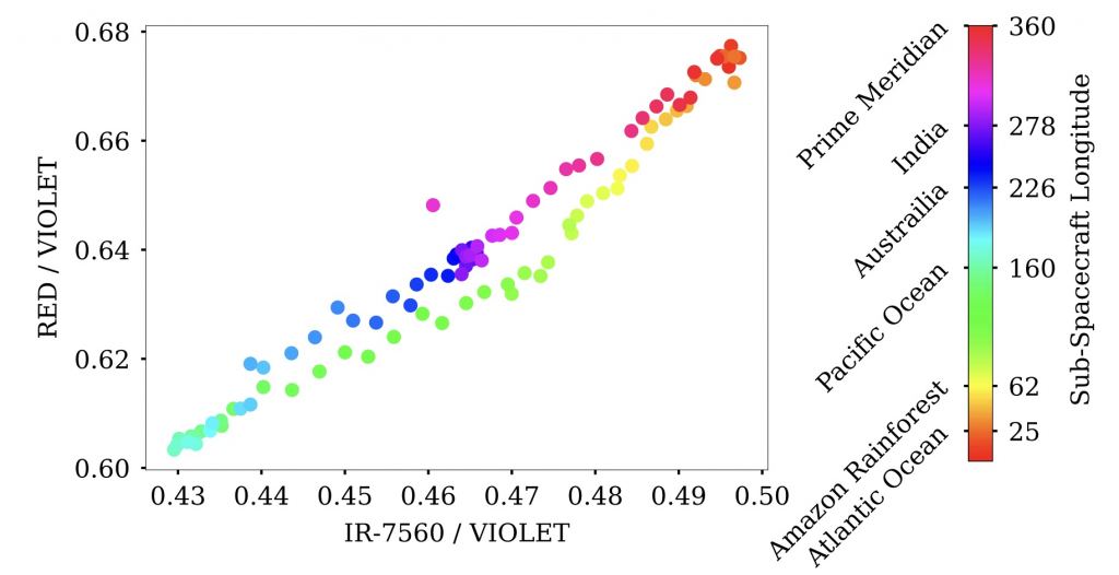 So in this work, the team focused on what are known as disk-integrated images. This is where light from a planet is taken as a whole. Instead of a detailed image of Earth such as the one above, the team looked at integrated images from the Limited Solid State Imager (SSI). The disk-integrated images it gathers are similar to the images we can capture of exoplanets. They then looked at the overall brightness and spectra of these images to see what they could tell us about Earth.