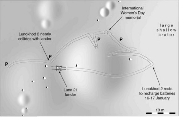 uncovered an interesting tidbit about the Lunokhods which she generously passed on to me. After a little research, I found out more about an "extracurricular activity" the two Lunokhod rovers were commanded to do along their traverses on the lunar surface. They each created "memorials" to women on the Moon.