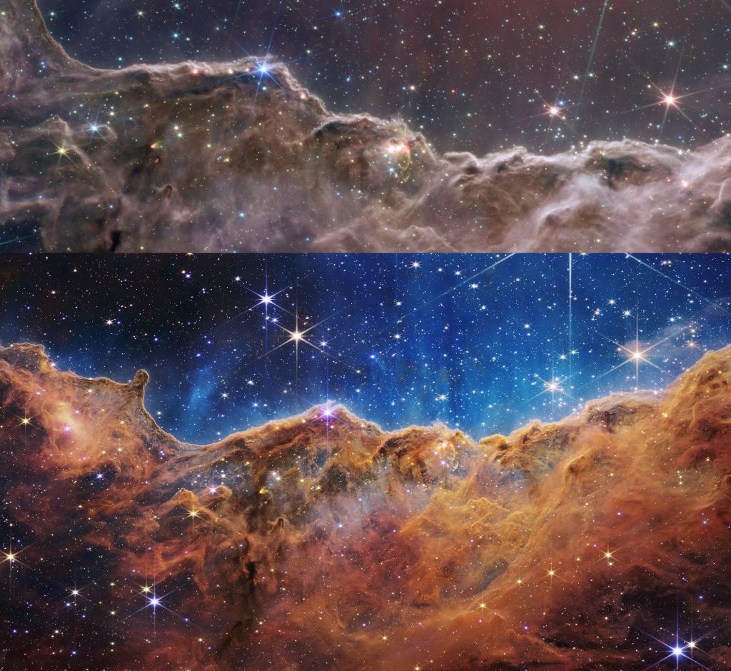 Next up, there's the image of the "Cosmic Cliffs," an ionized bubble formed by hot young stars near the easter edge of the star-forming Carina Nebula (NGC 3324). Located approximately 8,500 light-years from Earth in the Carina–Sagittarius Arm of the Milky Way galaxy, this feature is one of several that became iconic thanks to previous images acquired by Hubble. Once again, the JWST provided images of superior quality thanks to its advanced IR suite, which provided a more detailed view of this star-forming region.