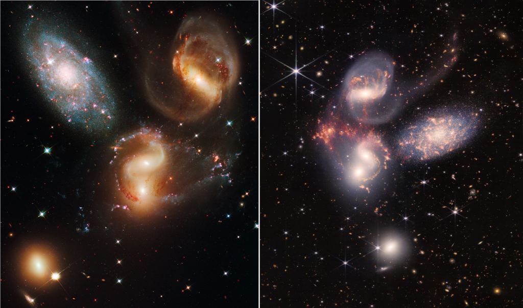 This collection of galaxies takes its name from French astronomer Édouard Stephan, who made the first recorded observation from the Marseille Observatory in 1877. It consists of at least four individual large galaxies at an average distance of 288.9 million light-years (which appear to be actively merging). The fifth galaxy (NGC7320) is not interacting and is instead in an apparent chance alignment with the group - where they look like they are merging relative to the observer but are actually very far apart. This galaxy group was viewed multiple times between June 11th and 20th using multiple instruments - including NIRCam, MIRI, and NIRSpec.