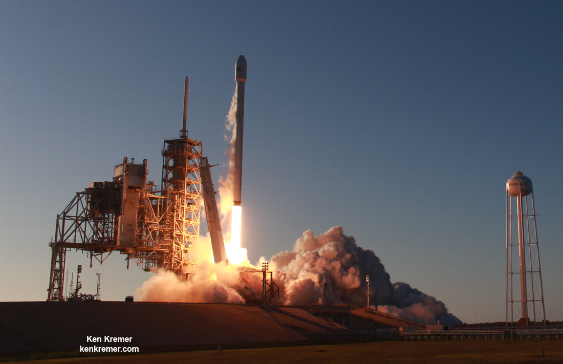 15 May 2017 blastoff of SpaceX Falcon 9 rocket from pad 39A on NASA's Kennedy Space Center in Florida carrying Inmarsat 5 F4 broadband satellite to geostationary orbit - as seen from ITL Causeway with USAF/SpaceX satellite processing facility. Credit: Ken Kremer/Kenkremer.com[/caption]