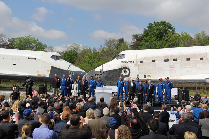 The official handover ceremony was witnessed by a prestigious gathering of some three dozen astronauts including more than a dozen men and women who served as Commanders of Space Shuttle Discovery and Senator and Astronaut John Glenn, the first American to orbit the Earth 50 years ago in 1962.