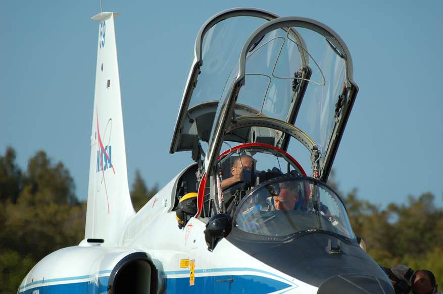 CAPE CANAVERAL – Arriving in their trademark T-38 Talon jets, the crew that will fly the last mission of the space shuttle Discovery arrived at NASA's Kennedy Space Center in Florida. The astronauts landed at the Shuttle Landing Facility (SLF) at 3:45 p.m. EDT and took a few moments to speak to members of the media and pose for pictures before heading off to prepare for their 11-day mission.