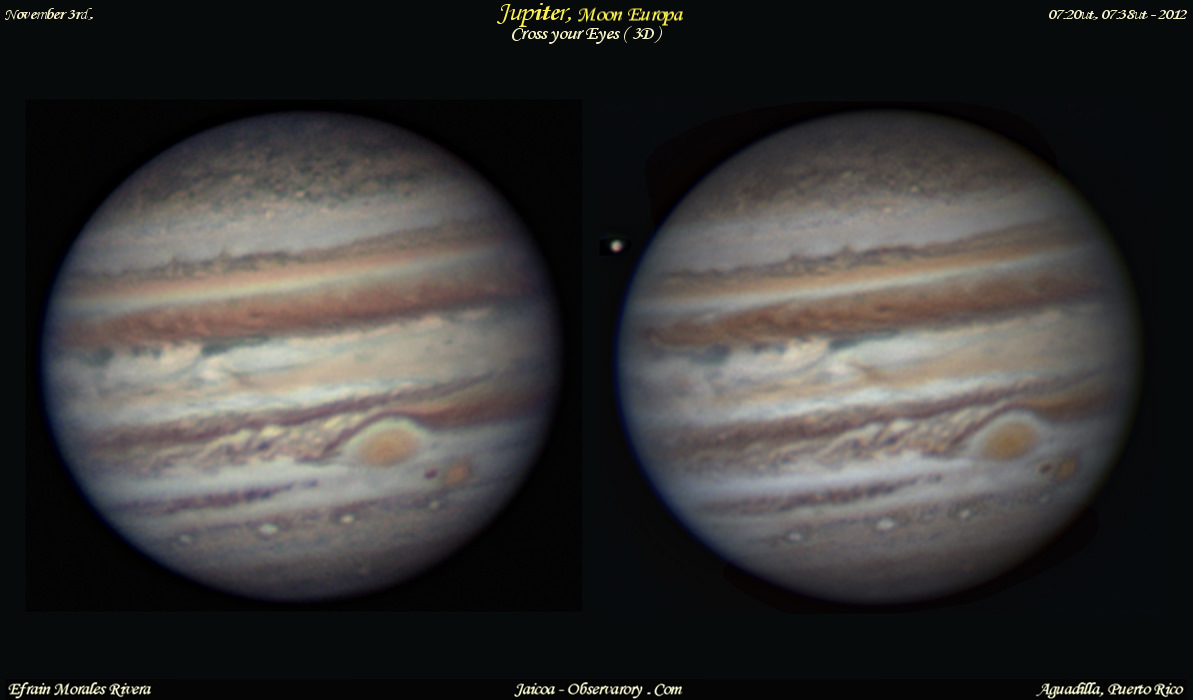 Efrain took the image on November 4th, at 07:20 UTC. Also visible are the Great Red Spot and Oval Ba transiting across the Jovian disk.