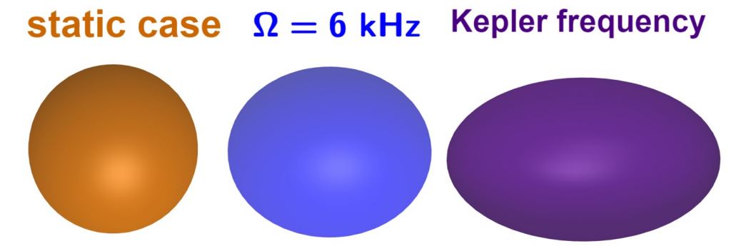 There are some pulsars that have very high rotation frequencies. The fastest observed pulsars, known as millisecond pulsars, can have frequencies above 700 Hz. It's pretty astonishing when you think about it. An object with nearly twice the mass of the Sun, but only a few kilometers across and making hundreds of rotations a second. Millisecond pulsars rotate so quickly that they aren't even spherical. They bulge out around their equators to become oblate spheroids. This means the density in their polar regions must be much higher than near the equator. This raises the question of whether neutrons in the polar regions might undergo a phase transition into quark matter.