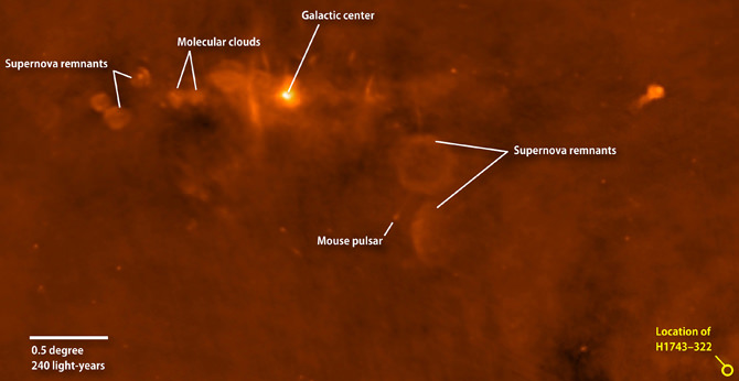 In mid-2009 a binary star system cataloged as H H1743–322 shot off something very unusual. Poised about 28,000 light years distant in the direction of the constellation of Scorpius, this rather ordinary system made up of a normal star and unknown mass black hole was busy exchanging mass. The pair orbits in mere days with a stream of material flowing continuously between them. This gas causes a flat accretion disk measuring millions of miles across to form and it is centered on the black hole. As the matter twirls toward the center, it becomes compressed and heats to tens of millions of degrees, spitting out X-rays... and bullets.