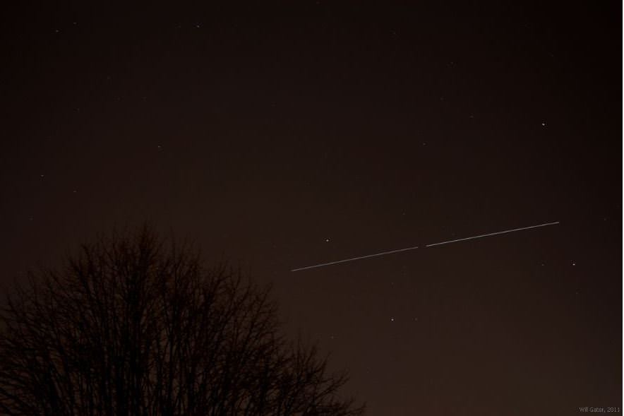 reports that the station and shuttle will be flying over parts of the United States and Europe Monday and Tuesday, appearing in the night sky as a closely-spaced pair of bright lights. The ISS is bigger, so will appear as the brighter object trailing the smaller Discovery as they move across the sky.