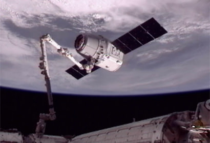 [caption id="attachment_95433" align="alignleft" width="400" caption="SpaceX Dragon successfully grappled today, May 25, 2012 in a historic making feat by astronauts using the robotic arm aboard the International Space Station (ISS) at 9:56 a.m. (1356 GMT). Dragon is the first private spacecraft to ever dock at the ISS. Credit: NASA TV"]