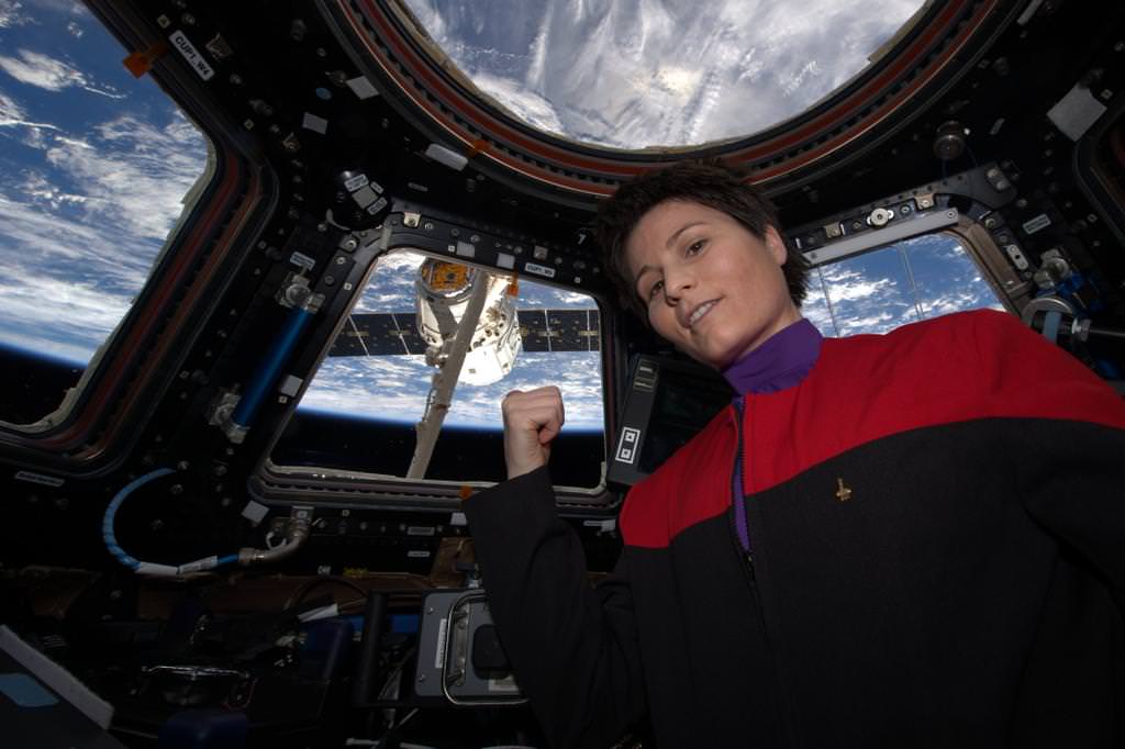 and Dragon cargo ship on Tuesday, April 14, the resupply vessel arrived at the International Space Station today, April 17, and was successful snared by the outposts resident 'Star Trek' crewmate, Expedition 43 Flight Engineer Samantha Cristoforetti of the European Space Agency, donning her futuristic outfit from the famed TV show near and dear to space fans throughout the known galaxy!