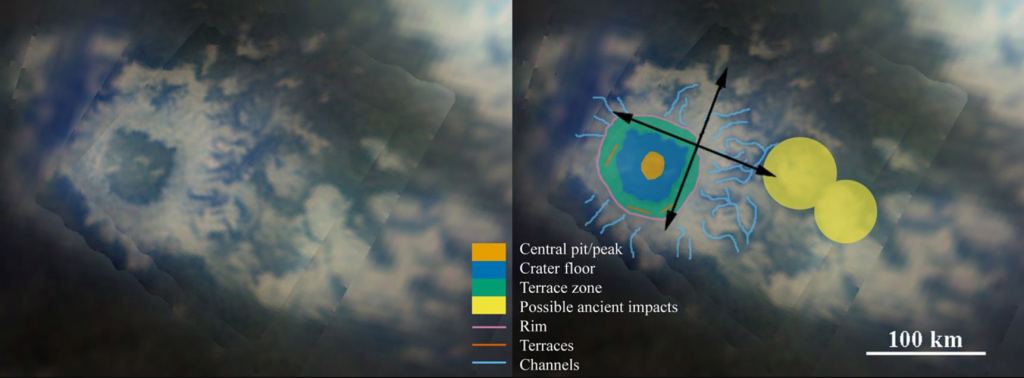 Dragonfly's target is the Selk impact structure, near the edge of Shangri-La. Selk is a young impact crater about 90 km (56 mi) in diameter that features melt pools, sites where liquid water and organics could mix together to form amino acids or other biomolecules. Dragonfly will initially land at some dunes near the structure then begin exploring the region and its chemistry.