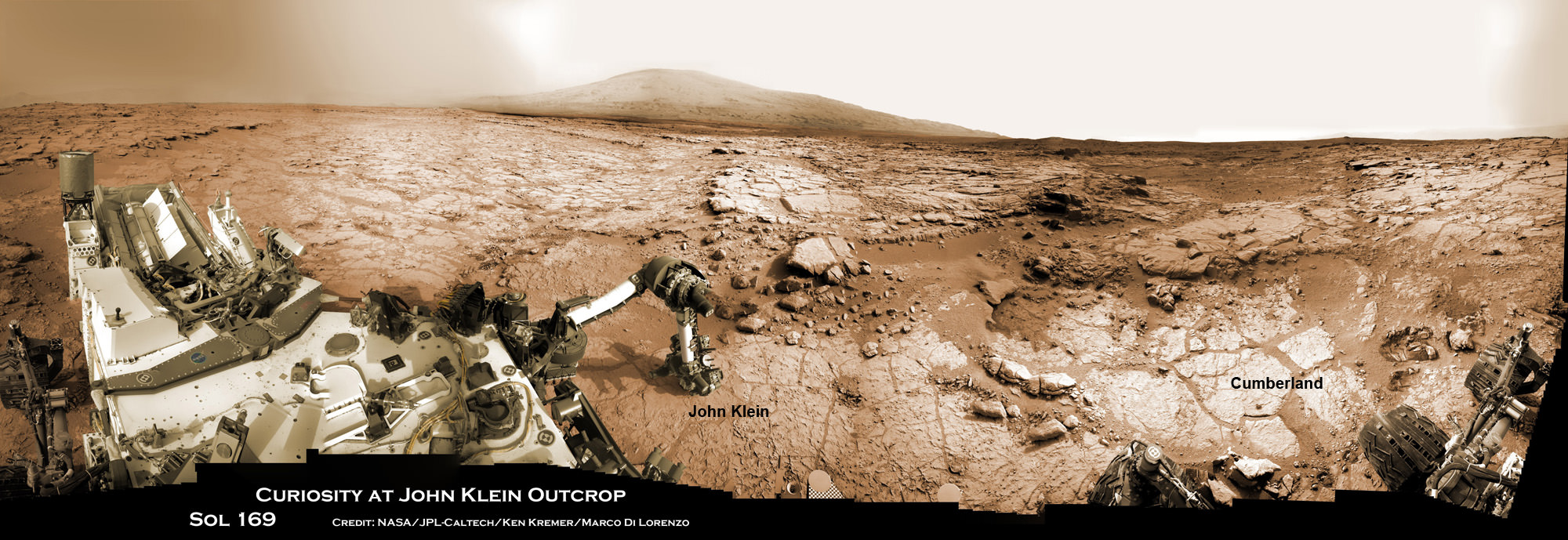 Analysis of the gray colored rocky Martian powder at 'John Klein' revealed that the fine-grained, sedimentary mudstone rock possesses significant amounts of phyllosilicate clay minerals; indicating the flow of nearly neutral liquid water and a habitat friendly to the possible origin of microbes.
