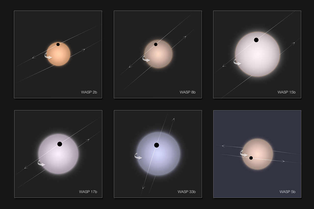 Six exoplanets out of twenty-seven were found to be orbiting in the opposite direction to the rotation of their host star — the exact reverse of what is seen in our own Solar System. The team announced the discovery of nine new planets orbiting other stars, and combined their results with earlier observations. Besides the surprising abundance of retrograde orbits, the astronomers also found that more than half of all the so-called "hot Jupiters" in their survey have orbits that are misaligned with the rotation axis of their parent stars.